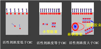 1、液體中的表面活性劑濃度在臨界膠束濃度(CMC)以下,這時(shí),靜態(tài)表面張力隨時(shí)表面活性劑濃度的增大而減少,如下圖的斜線部份。