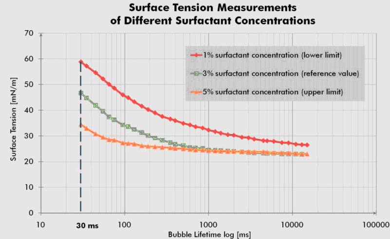 準備7-9個新樣品,其中濃度范圍要覆蓋應(yīng)用的濃度范圍。使用步驟1所確定的最佳氣泡壽命(30毫秒)來測量并得出標準曲線(表面張力與濃度的關(guān)系)。