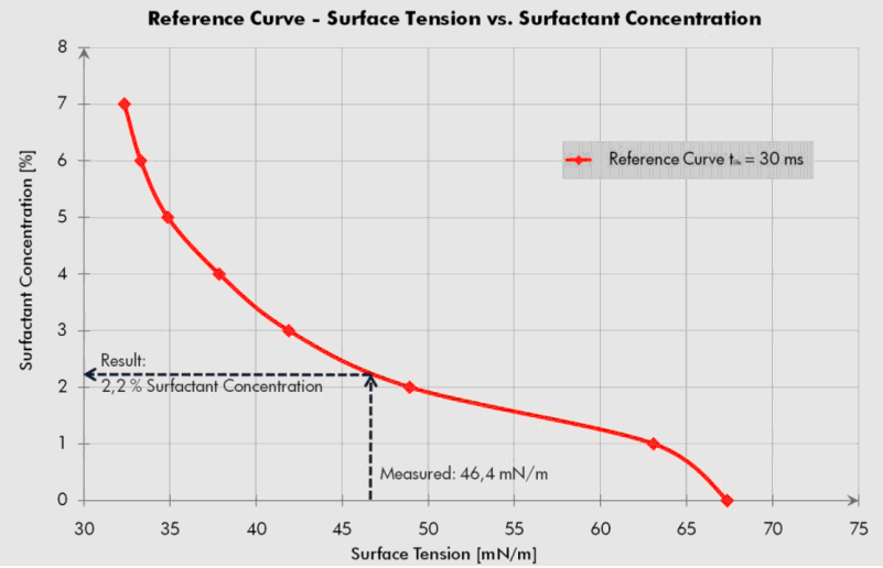 用在線模式或者用步驟一中的氣泡壽命時間(30毫秒)的單點測量模式,來分析一個未知濃度的活性劑的動態(tài)表面張力。測量出來的標準曲線反映出已測表面張力(表面活性劑的影響)和相應(yīng)的表面活性劑的聯(lián)系。